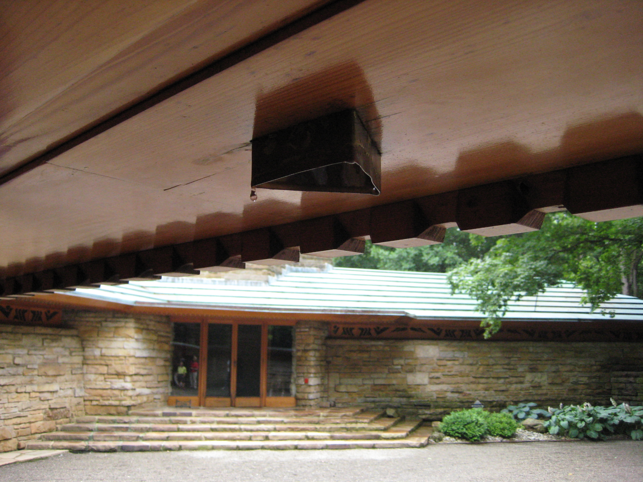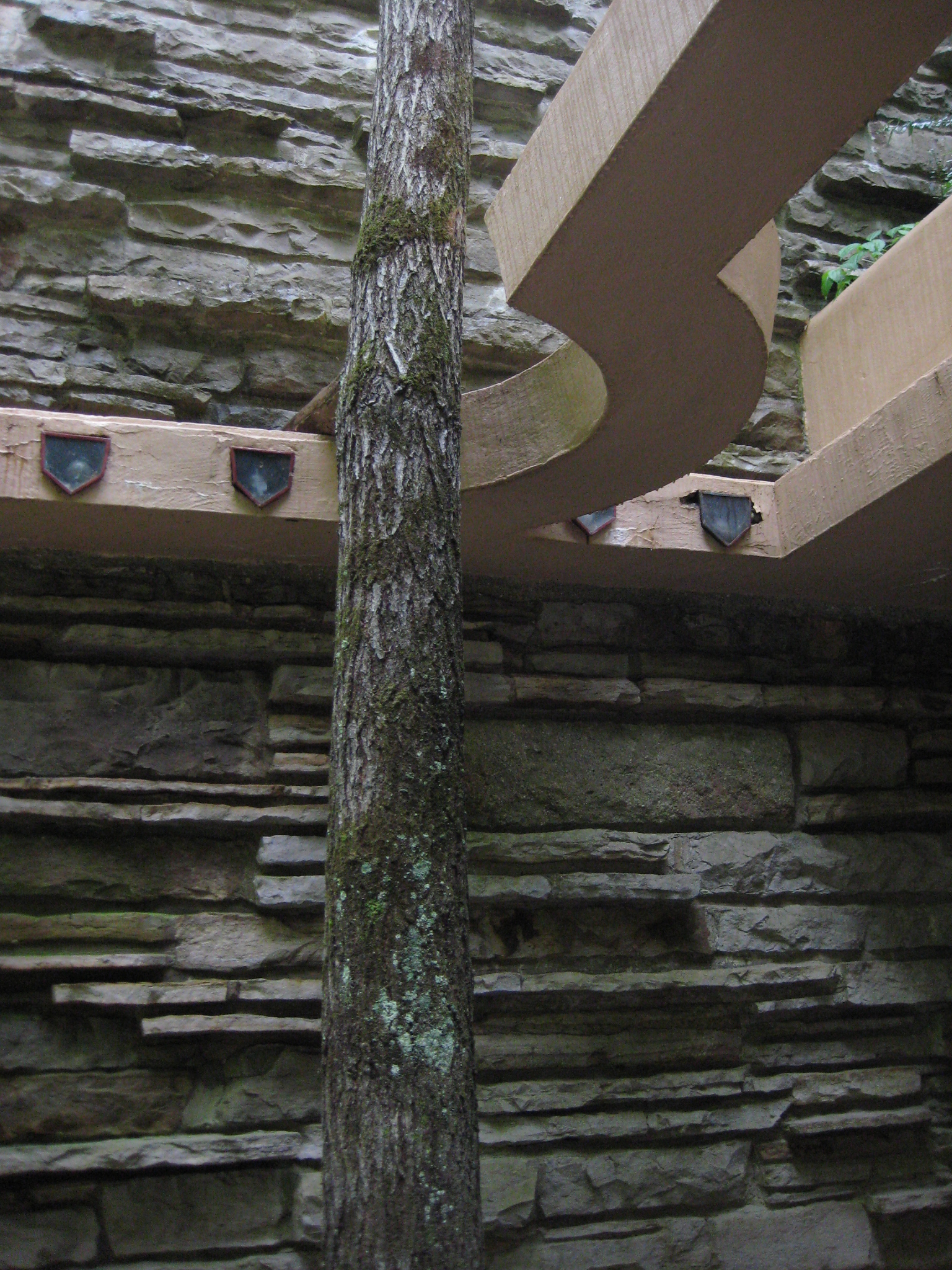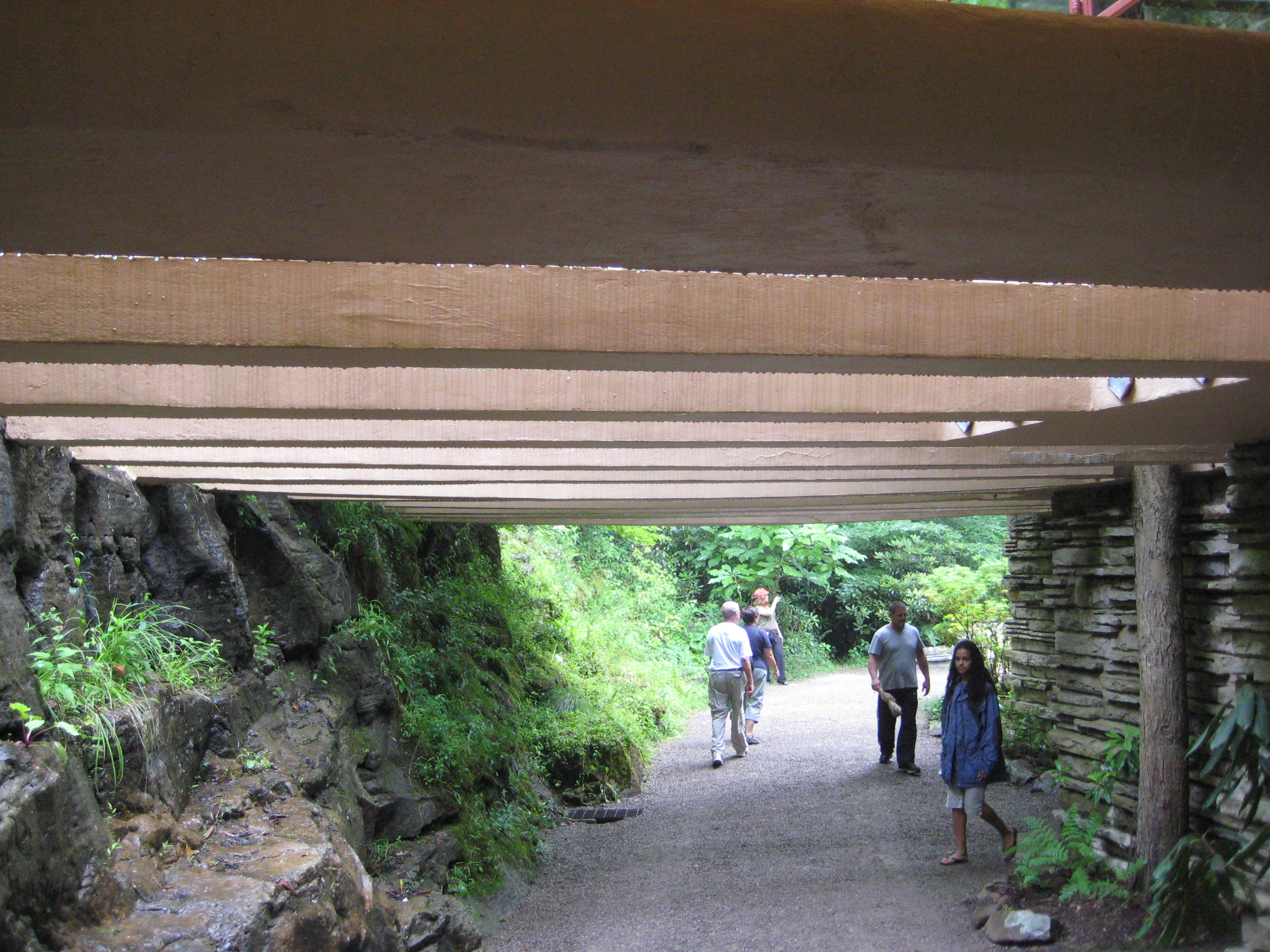 Fallingwater was first, and I may be the only one in our group who felt fortunate to be in the house while a thunderstorm rolled by. Our guide explained that FLW tried to blur the barriers between the structure and the cliffs, forest and water that surrounds it. With the rain falling as we looked out the corner bedrooms on the second and third floors, that line disintigrated further. I’ve never been in a structure that would have put its residents so close to their surroundings; turn nearly any corner and you’re faced with a wall of windows or a doorway to one of the terraces that jut out over the gorge.