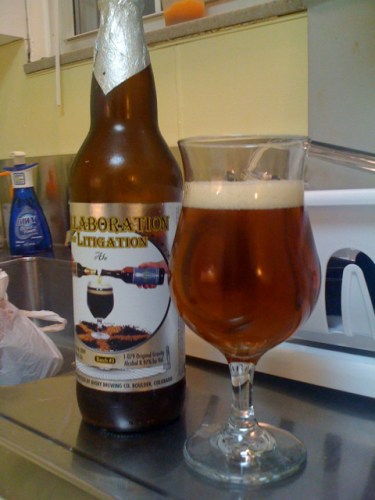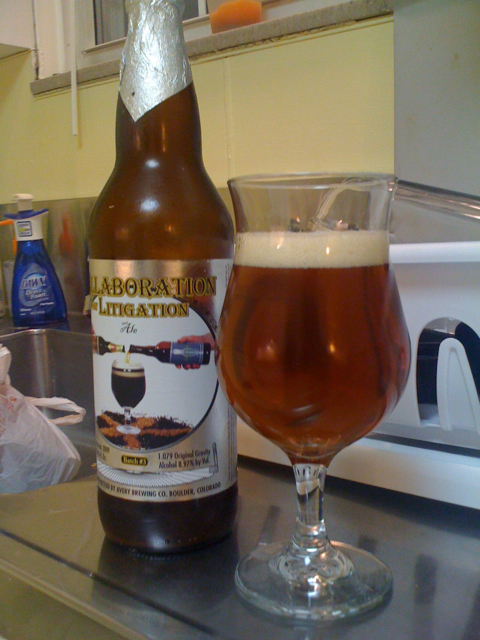 I picked a pretty good one to start: a 2009 (Batch 3) bomber of Collaboration Not Litigation Ale, a combination of the talents found at Avery Brewing and Russian River Brewing. The story behind this Belgian strong ale, as told on the Avery Web page, is a long one, but entertaining enough that I’ll include it here:
