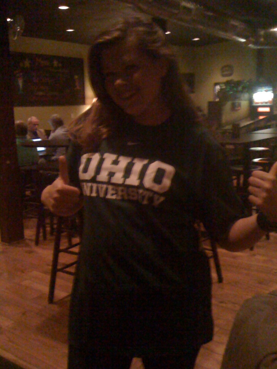 Back in March, I noticed that my OU Bobcats were to play a first-round game against the Georgetown Hoyas in the NCAA basketball tournament; I immediately got in touch with by friend and former colleague Robyn, who proudly possesses not one but two degrees from Georgetown, and we concocted a wager: at the first opportunity, the loser would have to buy beer for the winner, while the loser wore a shirt bearing the name of the winner’s school.