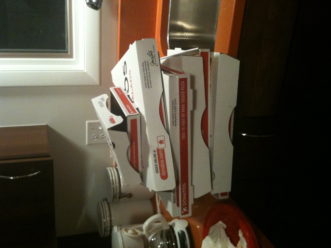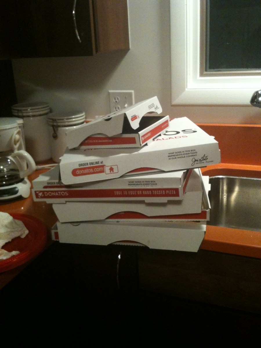 I, uh, nearly forgot to post something. So here: we ate a crapload of pizza Friday night.