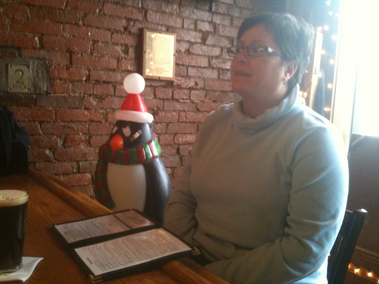 This picture of the penguin and Mrs. Crappy was taken at Ruggers today, not long after the seemingly mild-mannered lawn ornament caused a brawl there. Once things calmed down, we were able to enjoy a nice lunch with Jennie, who joined us, and AAA, who was working the day shift.