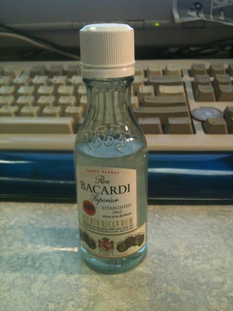 This very old mini-bar bottle of Bacardi has been passed around the newsroom for years. I assume I inherited it from Larissa, who just left while I was on vacation to take over the Patch job in Sewickley. It’s an honor to keep it in my desk, even though I’ll never drink a drop from the bottle.