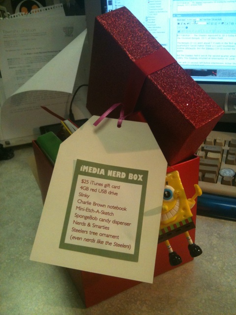 And then there was this, which I apparently won in absentia last week. It’s not only appropriate, but there’s some cool stuff in here — I needed a desk Slinky and the iTunes gift card will definitely come in handy. And the Steelers ornament? Yeah, it’ll go on the tree, after I give it to Mrs. Crappy.