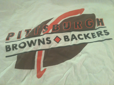 I also found this. That’s the front and back of my old Pittsburgh Browns Backers T-shirt. Between regular Sunday shifts for several years and our travel to Columbus for those other football games, I haven’t been able to watch a game with the club for years; the two seasons I was able to hang out with those folks were among the most fun I’ve had as a pro football fan (and yes, those were after the team returned to the league). The team was probably even worse back then, but being with like-minded people helped a bunch; it also made those rare wins even better.