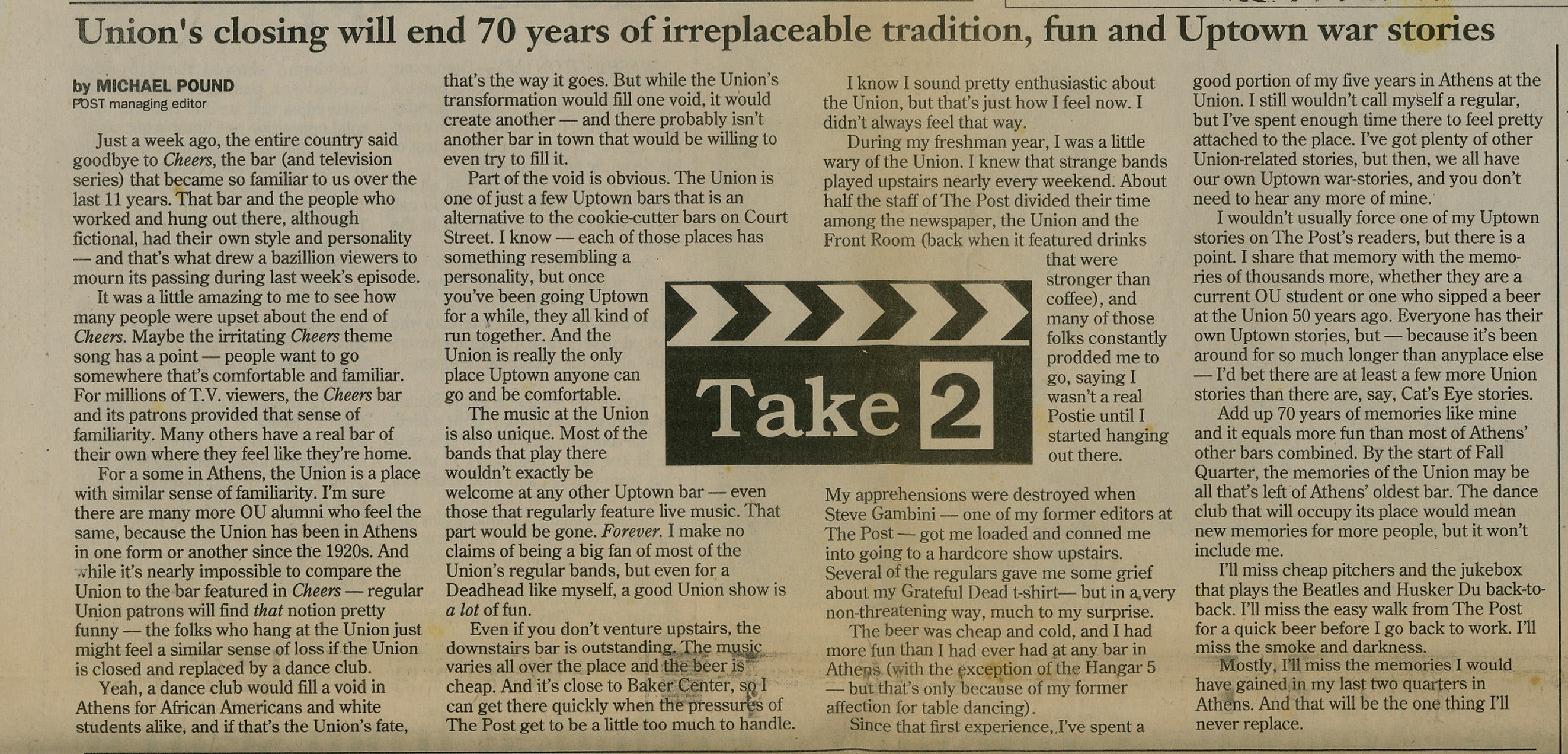 This column led to one of my favorite nights in Athens. A couple days later — on what was to have been the bar’s last night before the sale — a group of us walked in to find a pissed-off Lou, who hadn’t been told about the potential sale even though he had been the bar’s manager for years. We ordered our usual pitchers — Lowenbrau Dark was the first choice in those days; Lou plunked them down on the bar … and didn’t charge us. When that continued for another couple rounds, the word quietly got back to the newsroom two blocks away that there was free beer to be had at the Union. Lou wouldn’t take our money for the beer, so we kept piling it on the bar to be given to him as a tip at the end of the night. I know we killed three kegs — I think we were drinking Schlitz at the end of the evening — and we were able to give Lou, who got drunk with us, an impressive tip at last call.